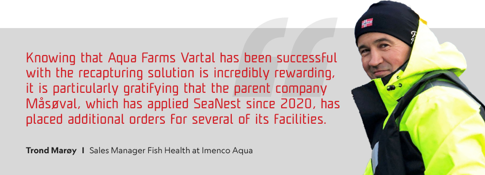 — Knowing that Aqua Farms Vartal has been successful with the recapturing solution is incredibly rewarding, it is particularly gratifying that the parent company Måsøval, which has applied SeaNest since 2020, has placed additional orders for several of its facilities, concludes Trond Marøy, Sales Manager Fish Health at Imenco Aqua.